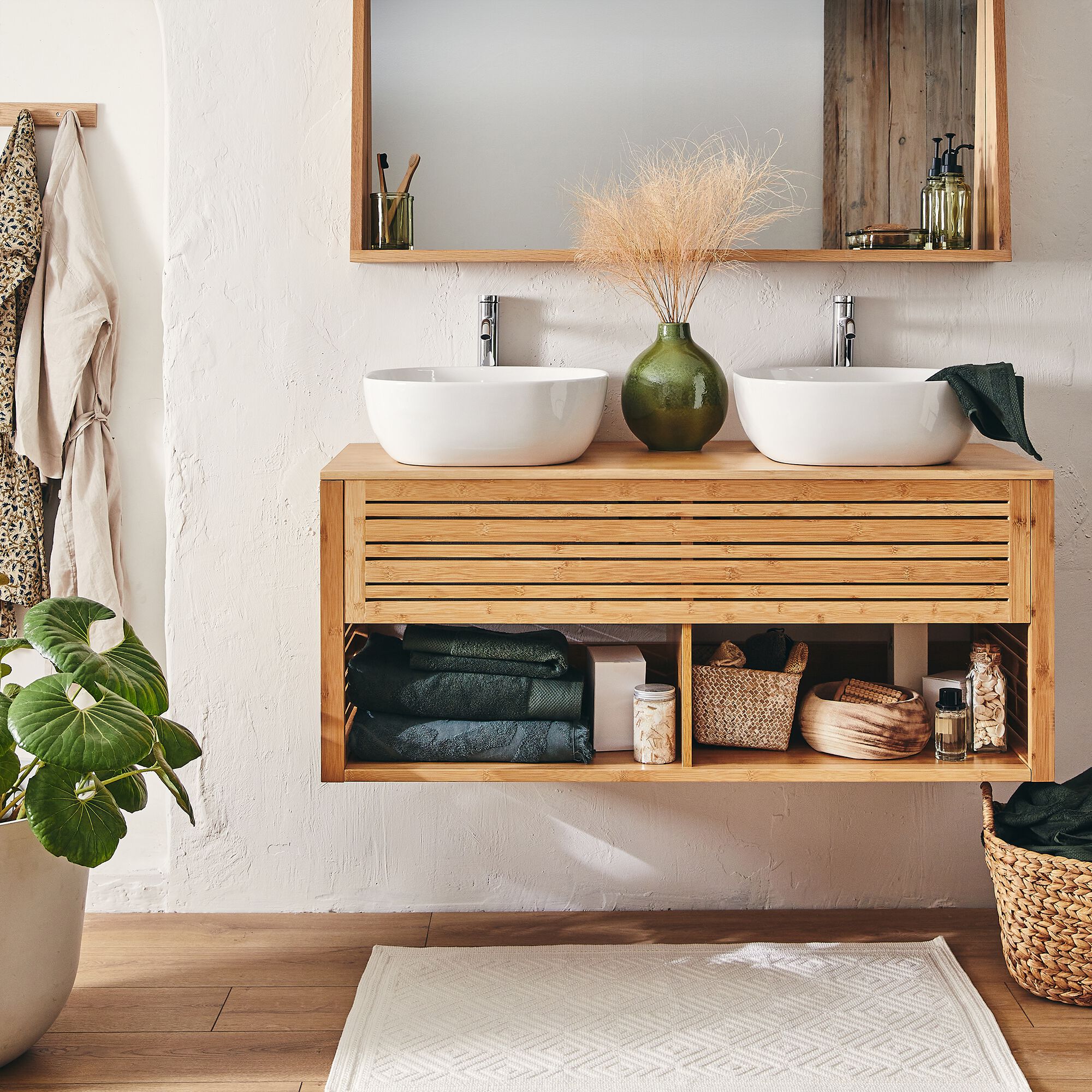 DANONG - Meuble double sous vasque murale en bambou - L120cm