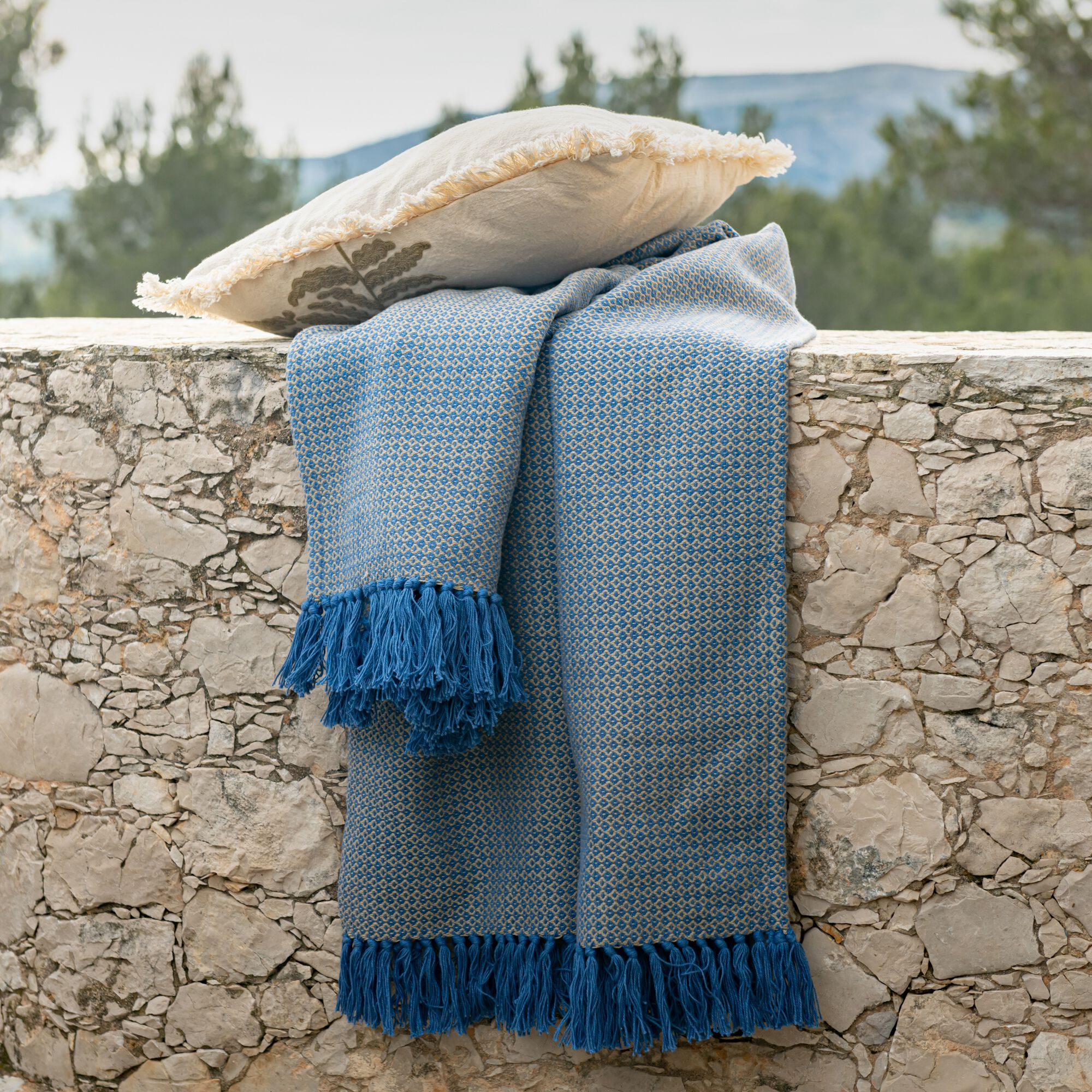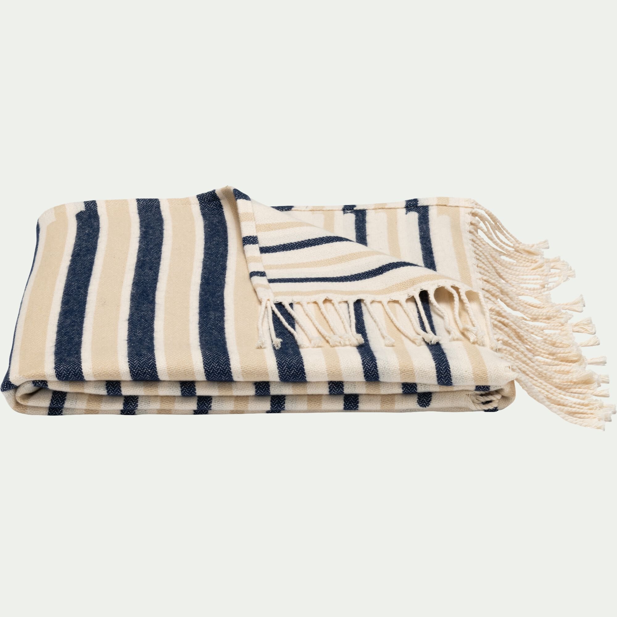 PARA - Plaid à franges motifs en coton - bleu 130X170cm